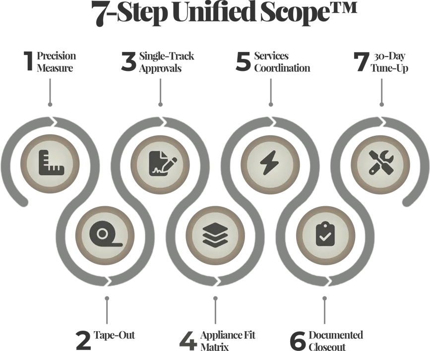 We engineer and install millimeter-fit kitchens, wardrobes, vanities, and media walls as one integrated system, on a protected install week—under one accountable team.